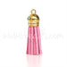 Eine putzige Erweiterung zu unserem Quasten-Sortiment. Hergestellt aus softem Wildleder und mit einem goldenen Köpfchen gekrönt, diese farbenfrohen Quasten sind der angesagte Trend für 2015. Sie werden Ihren handgemachten Schmuckstücken das trendige Etwas verleihen. Einfach einen Biegering an der vorhandenen Öse anbringen und dann Armbänder, Ketten, Ohrringe oder andere Accessoires fransig-toll dekorieren.